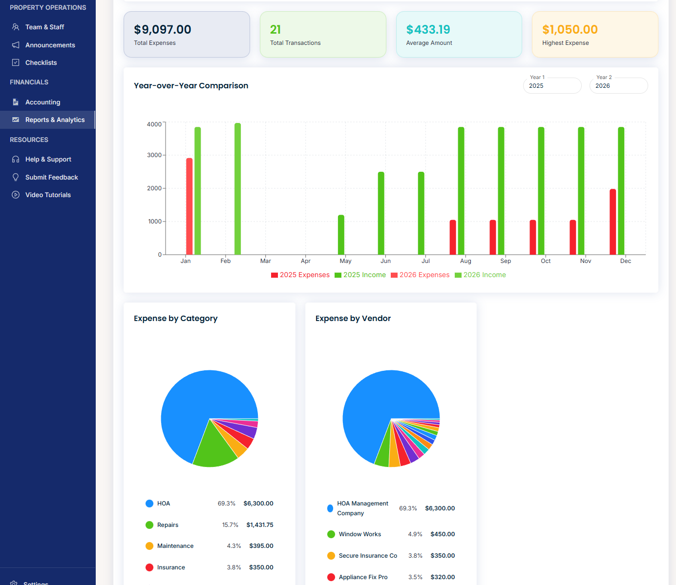 Generate Schedule E reports, rent ledgers, and expense breakdowns automatically. Easier to use and more affordable than QuickBooks. Replace your messy spreadsheets and piles of paper receipts with organized, tax-ready financial reports.